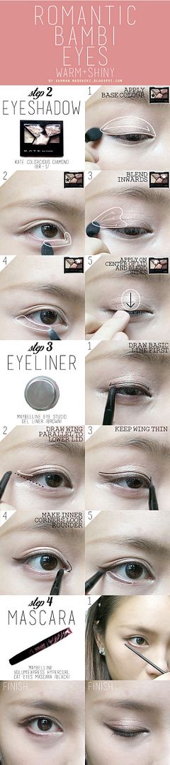 to add to the feminine look (for it to be categorized as romantic), wing out the eyeliner slightly and keep it thin. the angle should be parallel to the lower lashline (refer to pictorial above to get what i mean). i tried to make my eyes look rounder by drawing a semi circle instead of a triangle in my inner corners. rounder eyes are softer than sharper eyes!