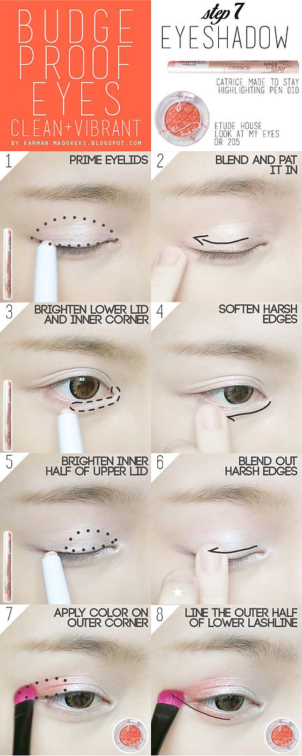 i used two products for this look. the first is a long wear highlighting pen from catrice. of course i found more ways to fully utilise it! thanks to its long wear formula, i can use this as an eyeshadow base! this thing is really really really made to stay. they chose a really suitable product name. the second is an orange eyeshadow. if you want more insurance, go for another oil resistant eyeliner pencil in any colour of your choice!