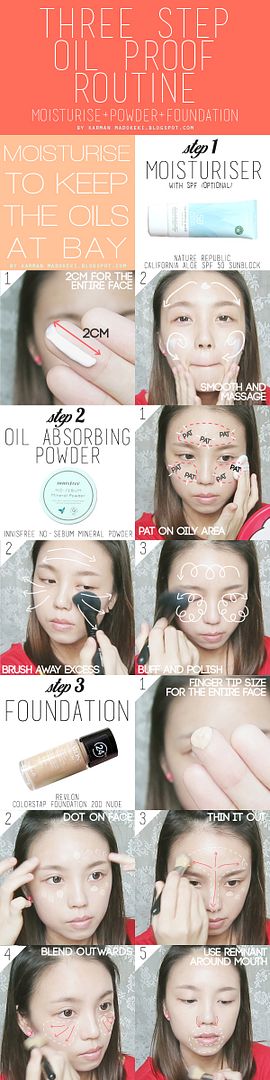the three step oil proof routine (see below) is very simple - moisturise, powder, foundation. that's right, the powder comes before the foundation! but not just any kind of powder. it has to contain silica, the prime ingredient in absorbing oils! the finish is very lightweight and smooth, when applied lightly it will not cake the foundation.